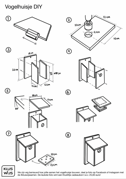 Download gratis de bouwtekening voor het maken van een vogelhuisje. Bekijk eerst samen met de leerlingen de tekening en lees zorgvuldig de aanwijzingen voordat je begint.